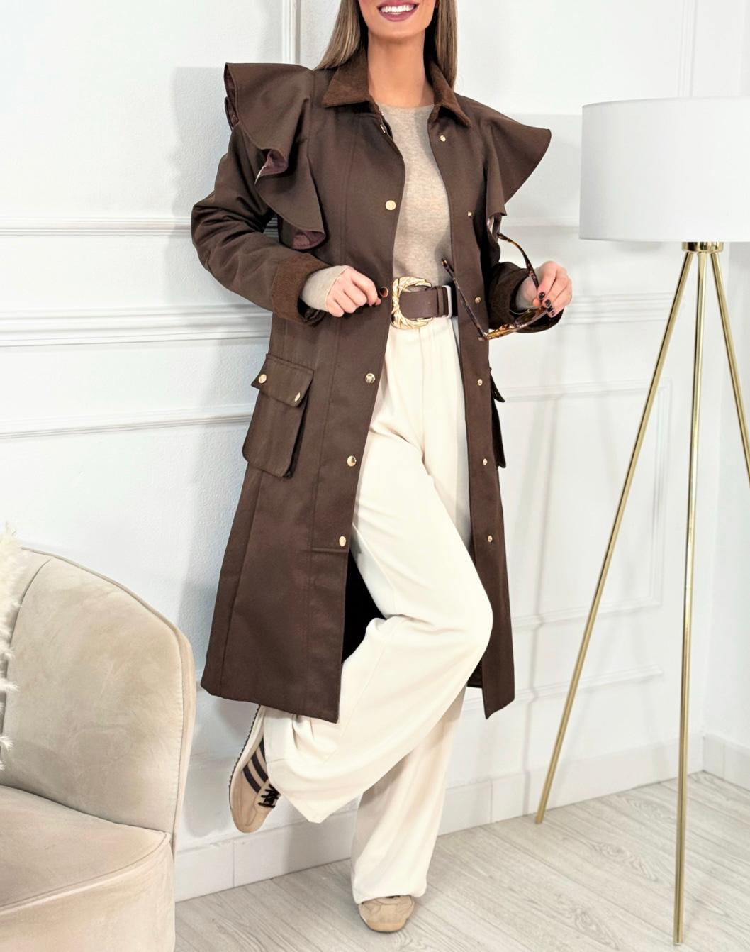 Gabardina acolchada y abrigada de mujer en color marrón confeccionada en tejido resistente con relleno interior, perfecta para proteger del frío en otoño e invierno. Su diseño destaca por los detalles decorativos en los hombros que aportan un toque femenino y diferente, manteniendo un estilo actual y sofisticado. El largo de 114 cm estiliza la silueta y ofrece mayor abrigo, convirtiéndola en una prenda práctica y elegante para el día a día. Incorpora cierre frontal con botones, bolsillos funcionales y forro interior que garantiza confort térmico y comodidad.