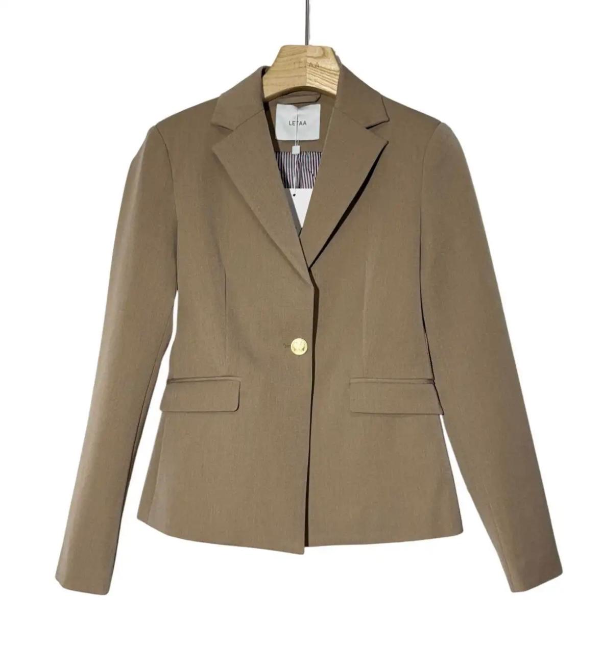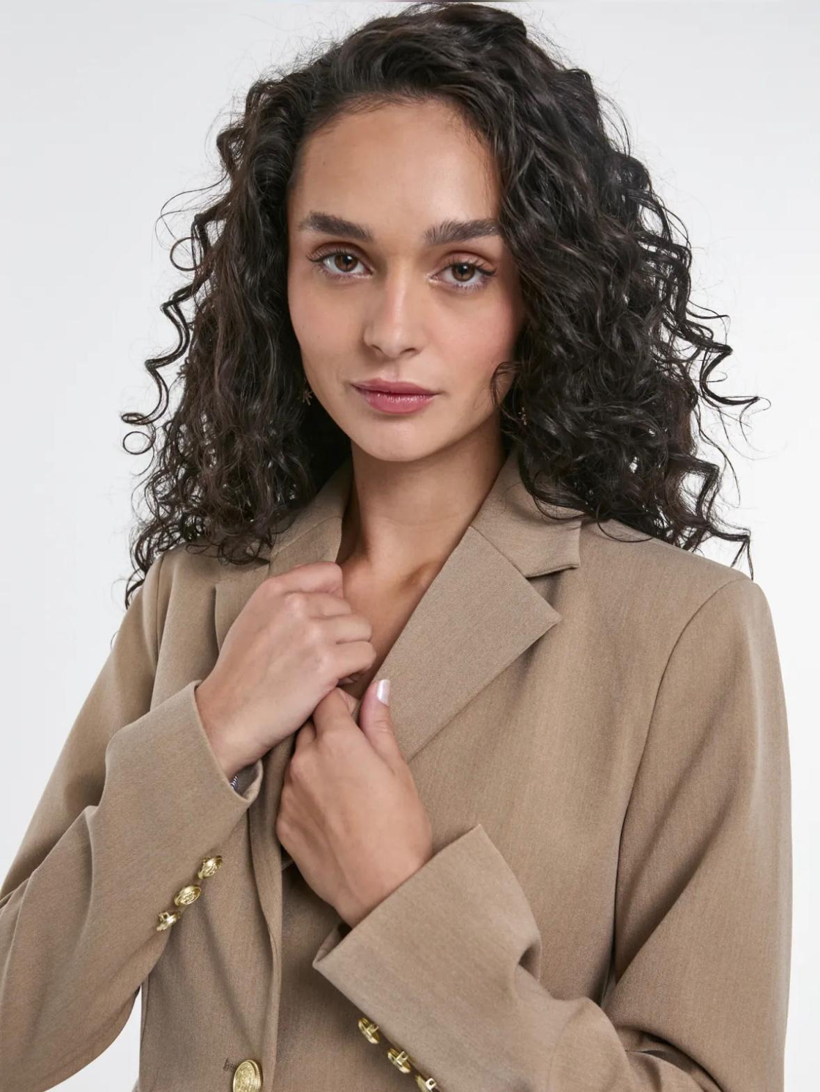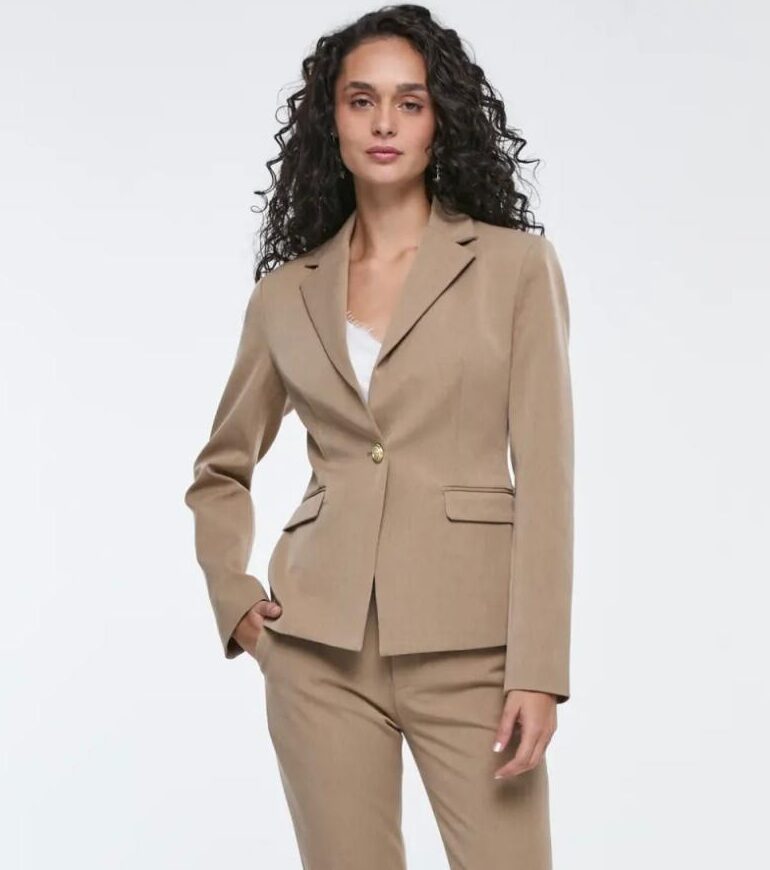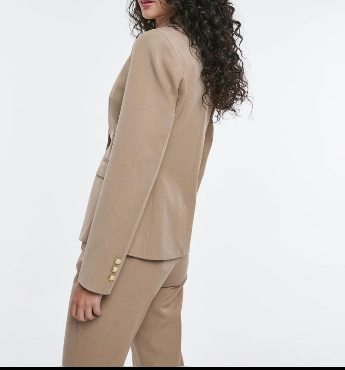 CHAQUETA TIPO BLAZER BEIGE CLARO, CORTE A LA CADERA, CIERRE DE UN BOTON.