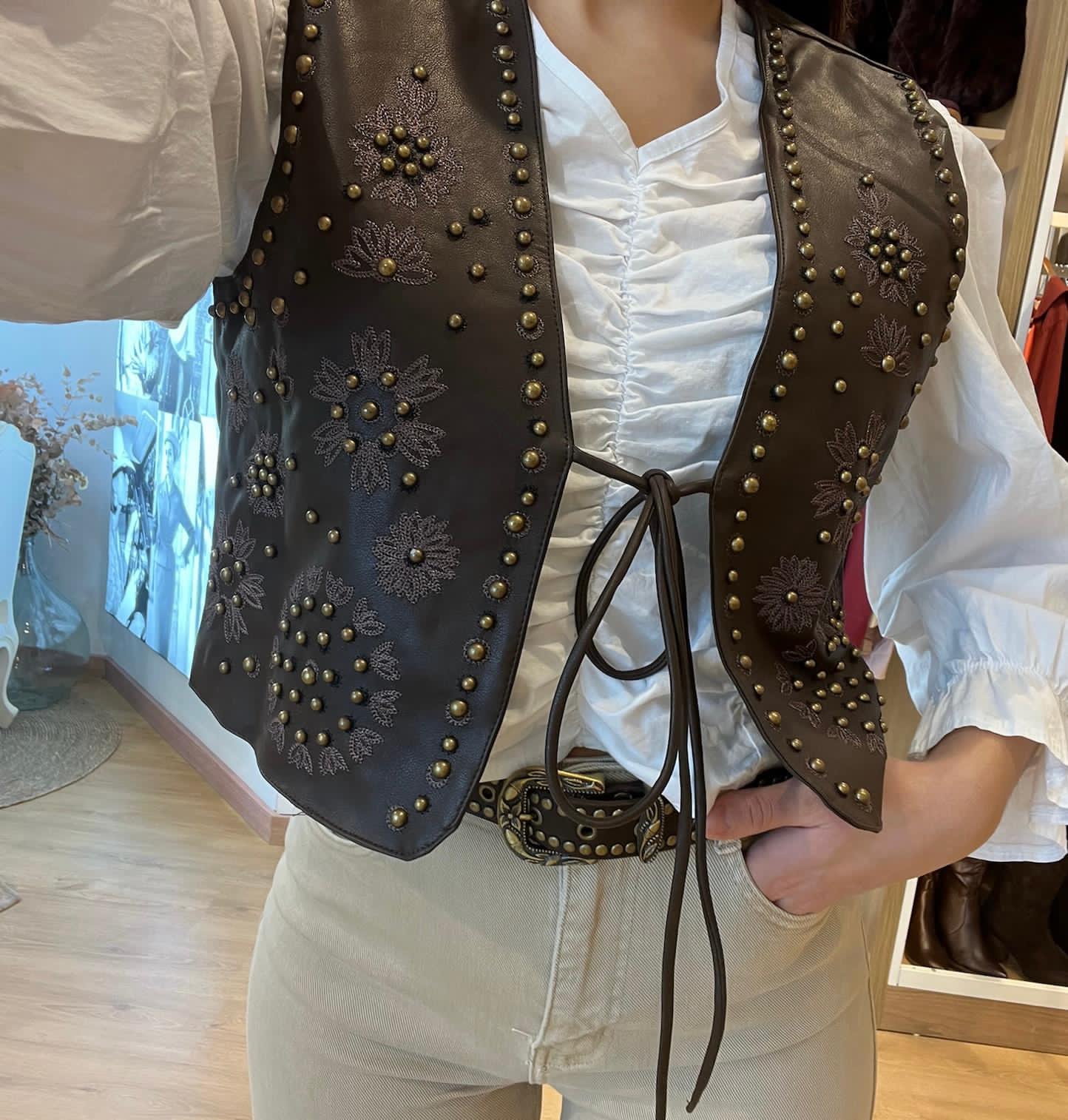 CHALECO MARRON CHOCOLATE CON TACHUELAS EN DORADO