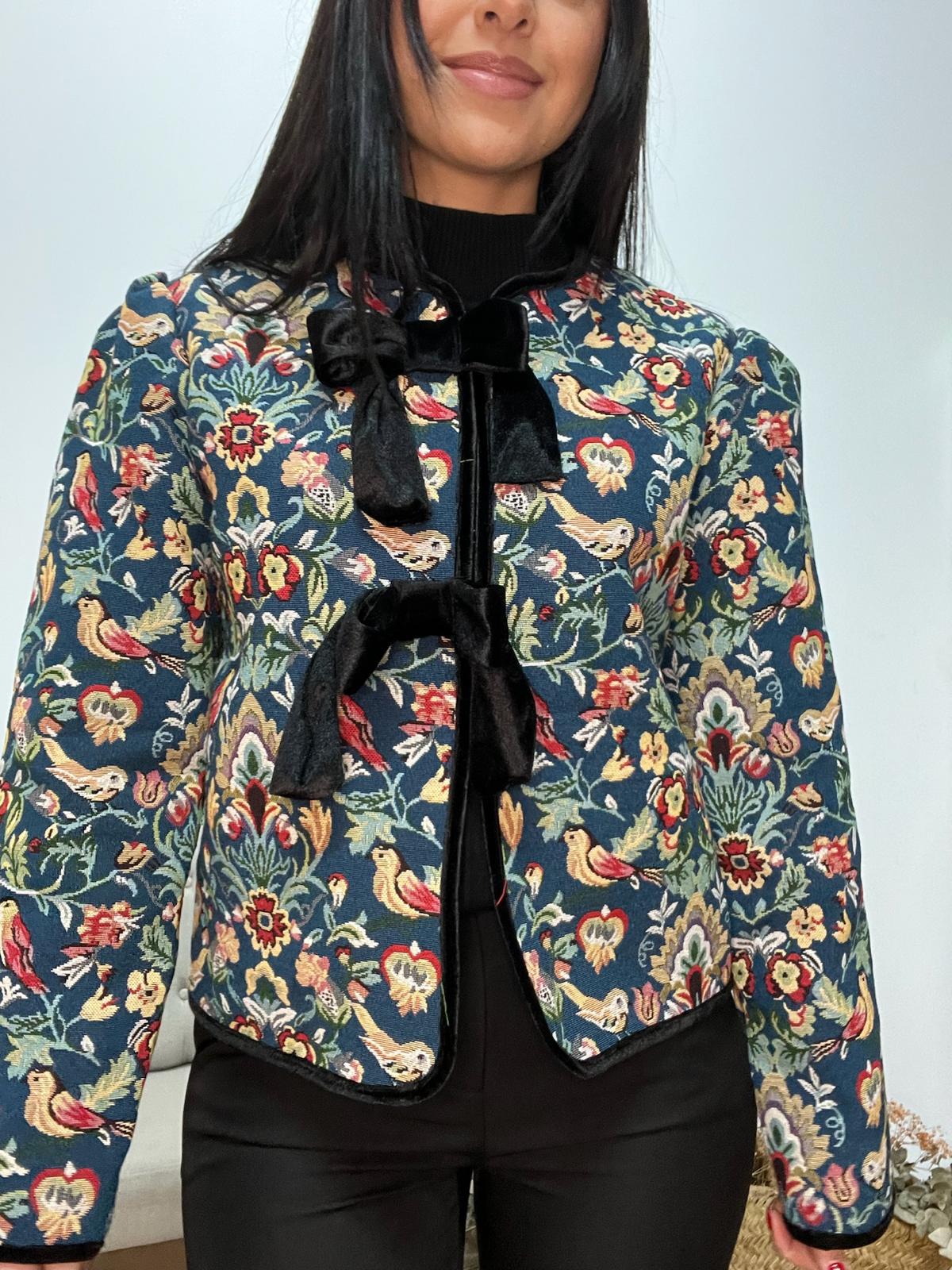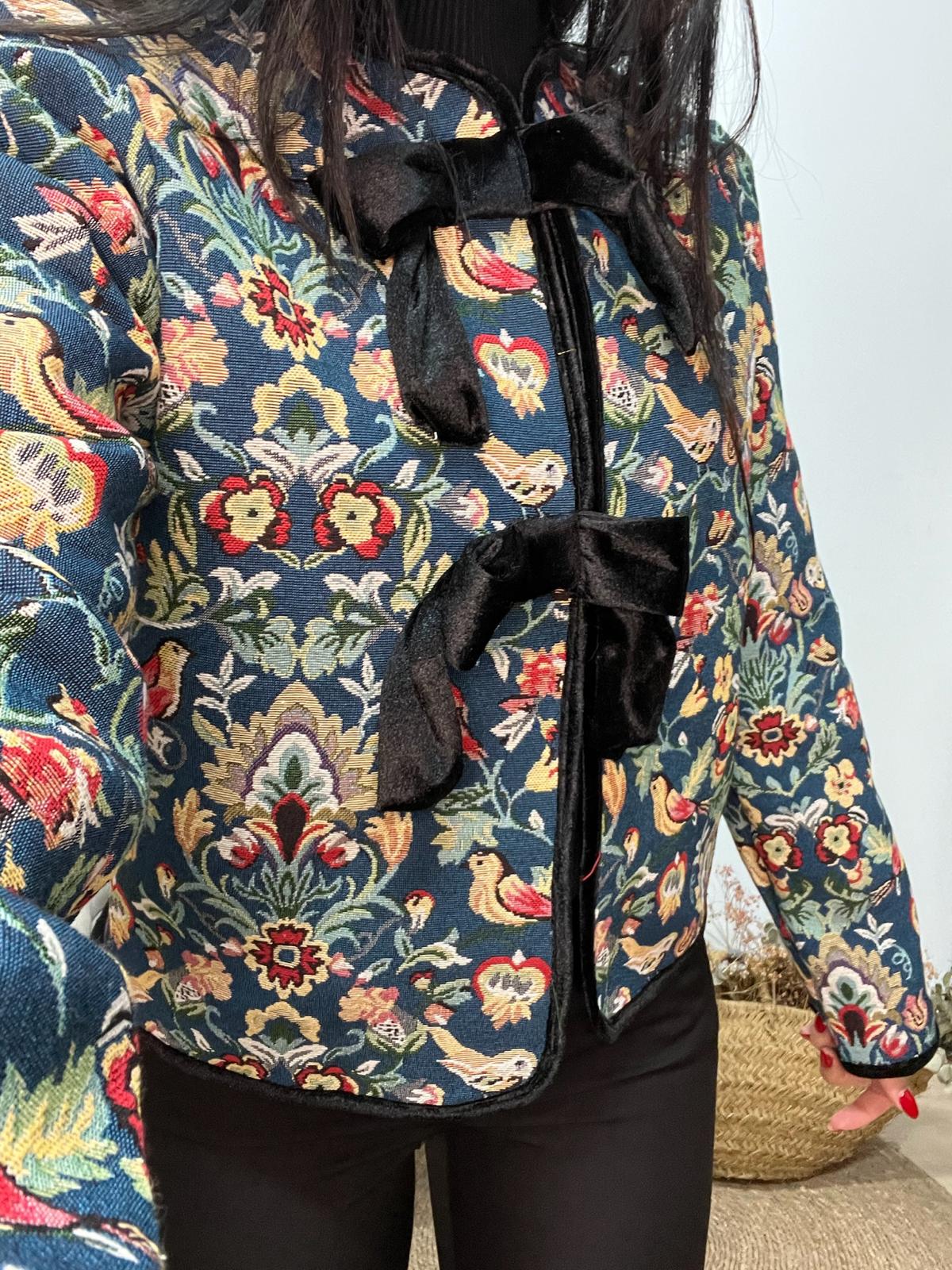 CHAQUETA FONDO AZUL MARINO CON BORDADO FLORAL, CON DETALLES Y LAZOS EN TERCIOPELO NEGRO