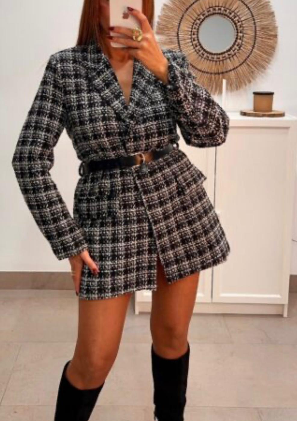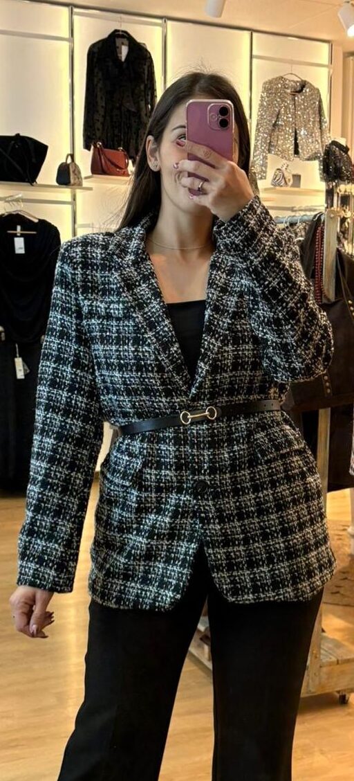CHAQUETA CON ESTAMPADO EN BLANCO Y NEGRO Y CORTE RECTO, CON BOLSILLOS CON DETALLES DE TAPETAS.