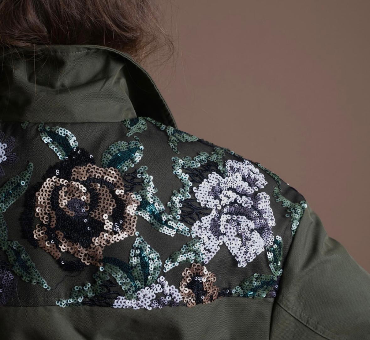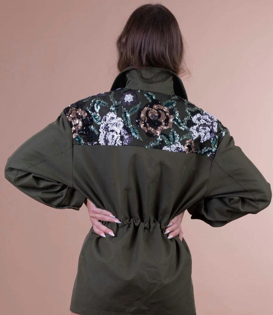CHAQUETA COLOR VERDE MILITAL CON DETALLE DE ESTAMPADO DE FLORES CON LENTEJUELAS EN LA PARTE DE LOS HOMBROS TANTO DELANTERA COMO TRASERA.