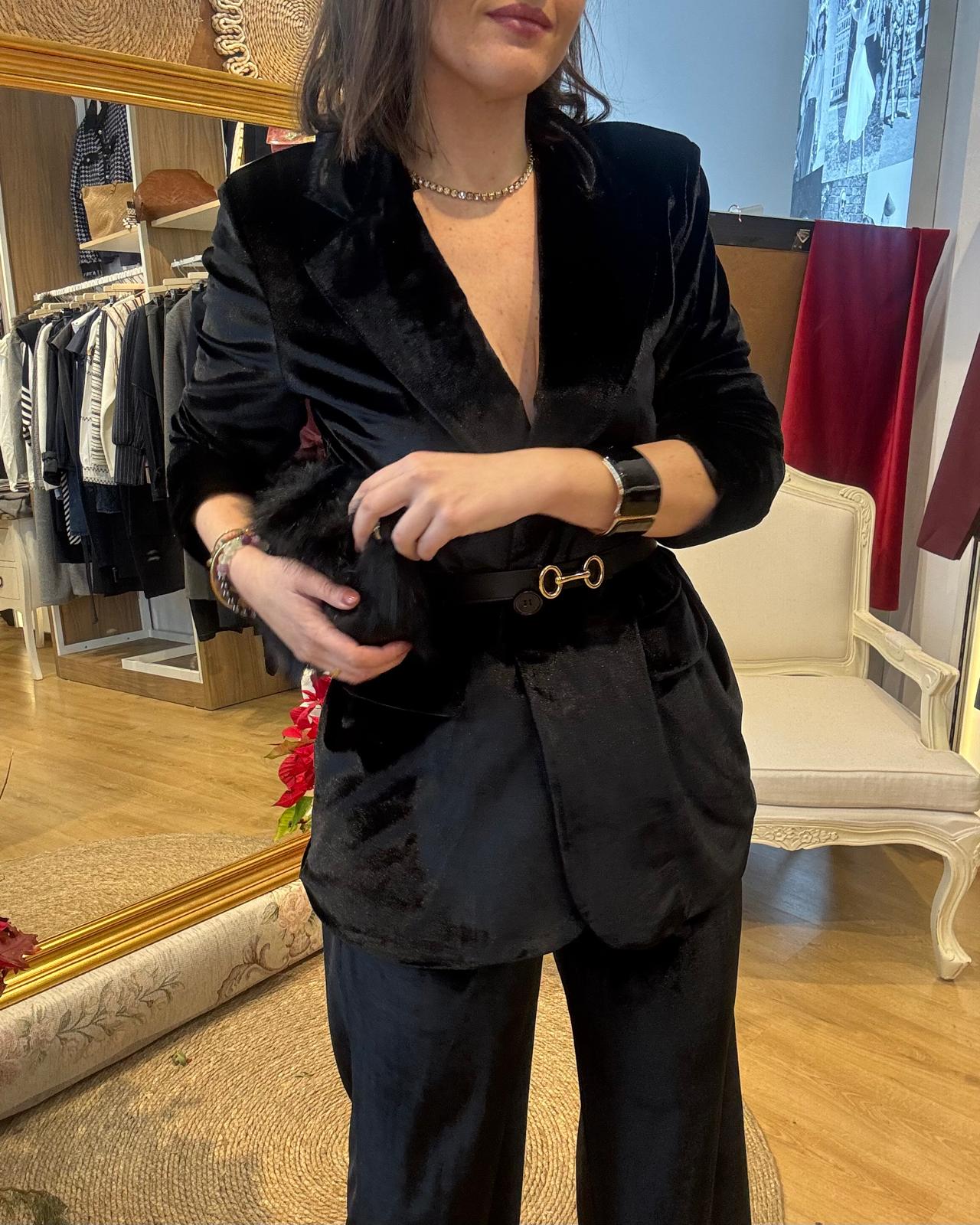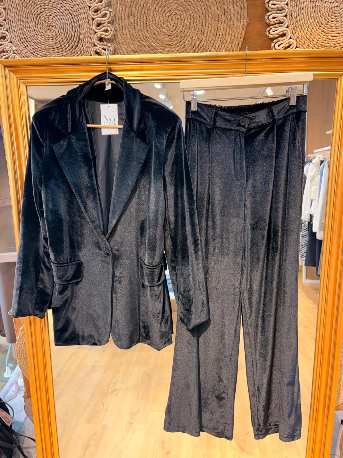 CONJUNTO DE DOS PIEZAS EN TERCIOPELO NEGRO, CON UN ACABADO ELEGANTE QUE REFLEJA LA LUZ DE FORMA SUTIL.