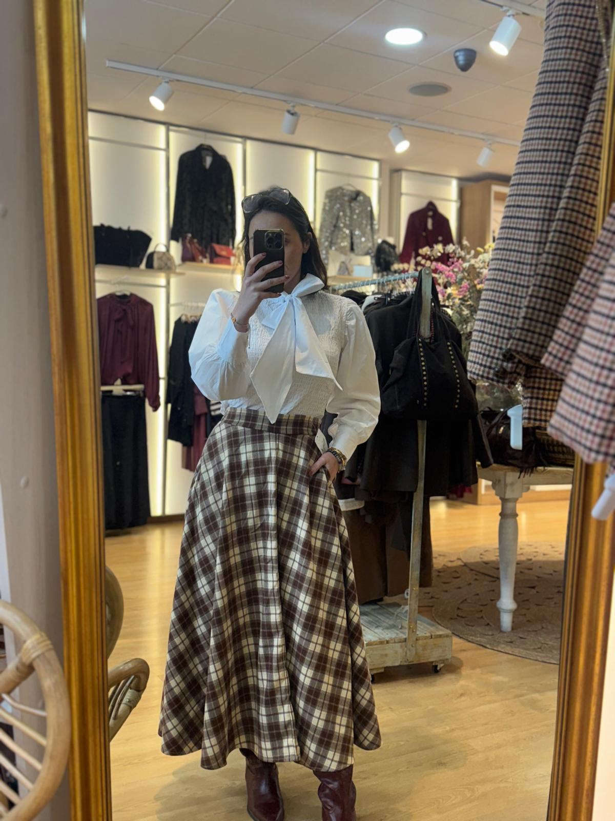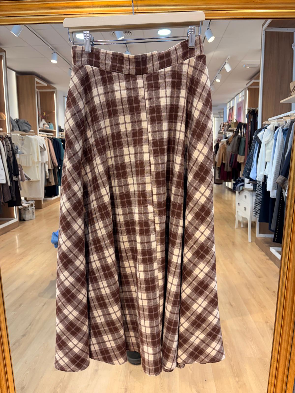 FALDA DE CORTE EVASÉ CON ESTAMPADO DE CUADROS EN TONOS MARRÓN Y BEIGE.