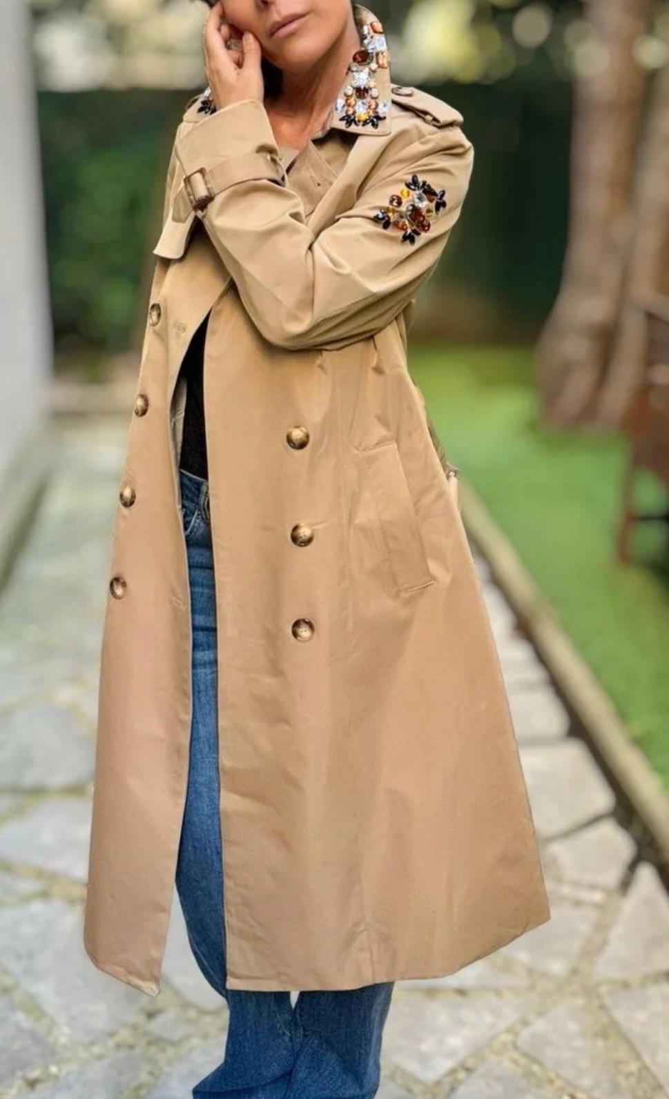 GABARDINA LARGA DE ESTILO CLÁSICO, CON UN TOQUE ACTUAL AL TENER APLICACIONES BORDADAS EN PEDRERÍA EN CUELLO, MANGAS Y PARTE FRONTAL.