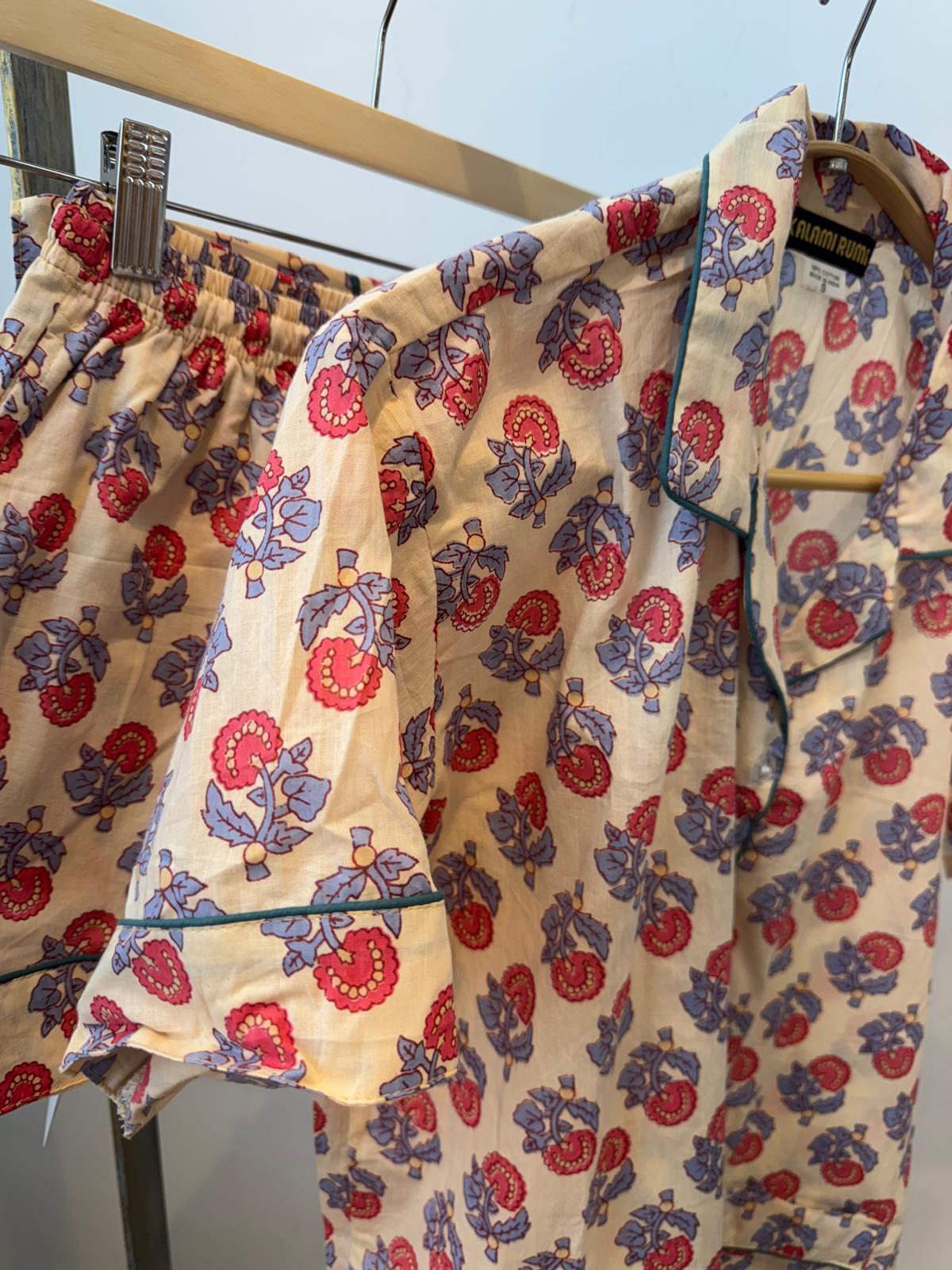PIJAMA CORTO DE ALGODON CON ESTAMPADO MANDALA HECHO A MANO EN LA INDIA + BOLSITA