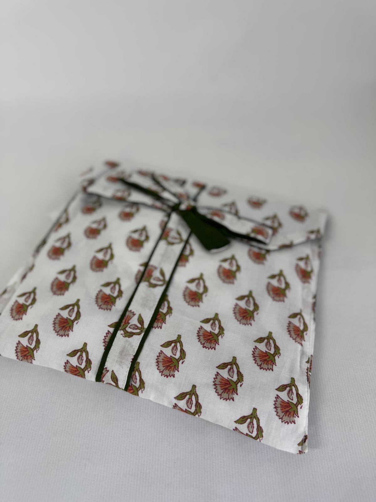 PIJAMA CORTO DE ALGODON CON ESTAMPADO NINDRA ROJA HECHO A MANO EN INDIA + BOLSITA