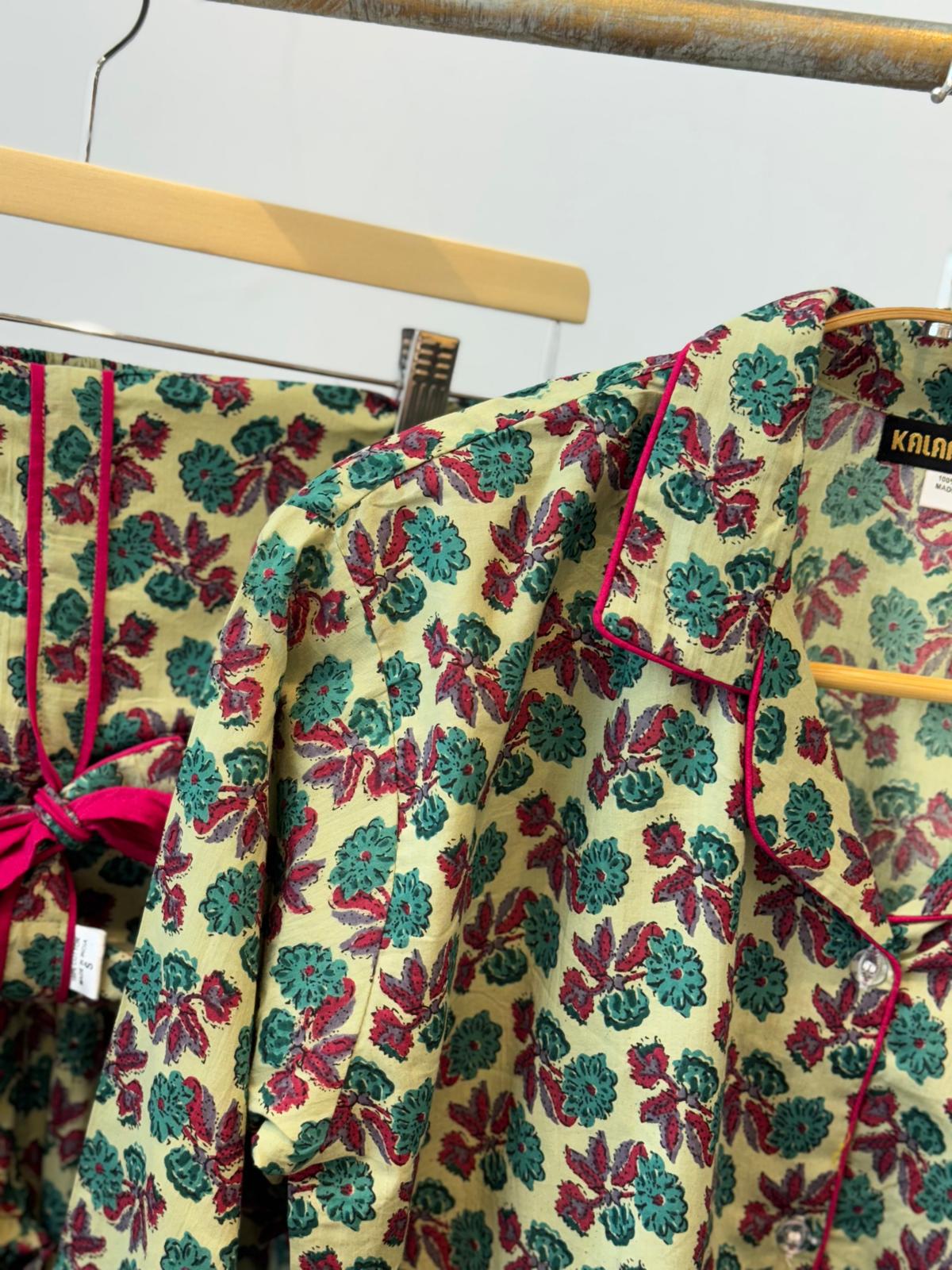 PIJAMA LARGO DE ALGODON ESTAMPADO INDIGO GARDEN HECHO A MANO EN LA INDIA
