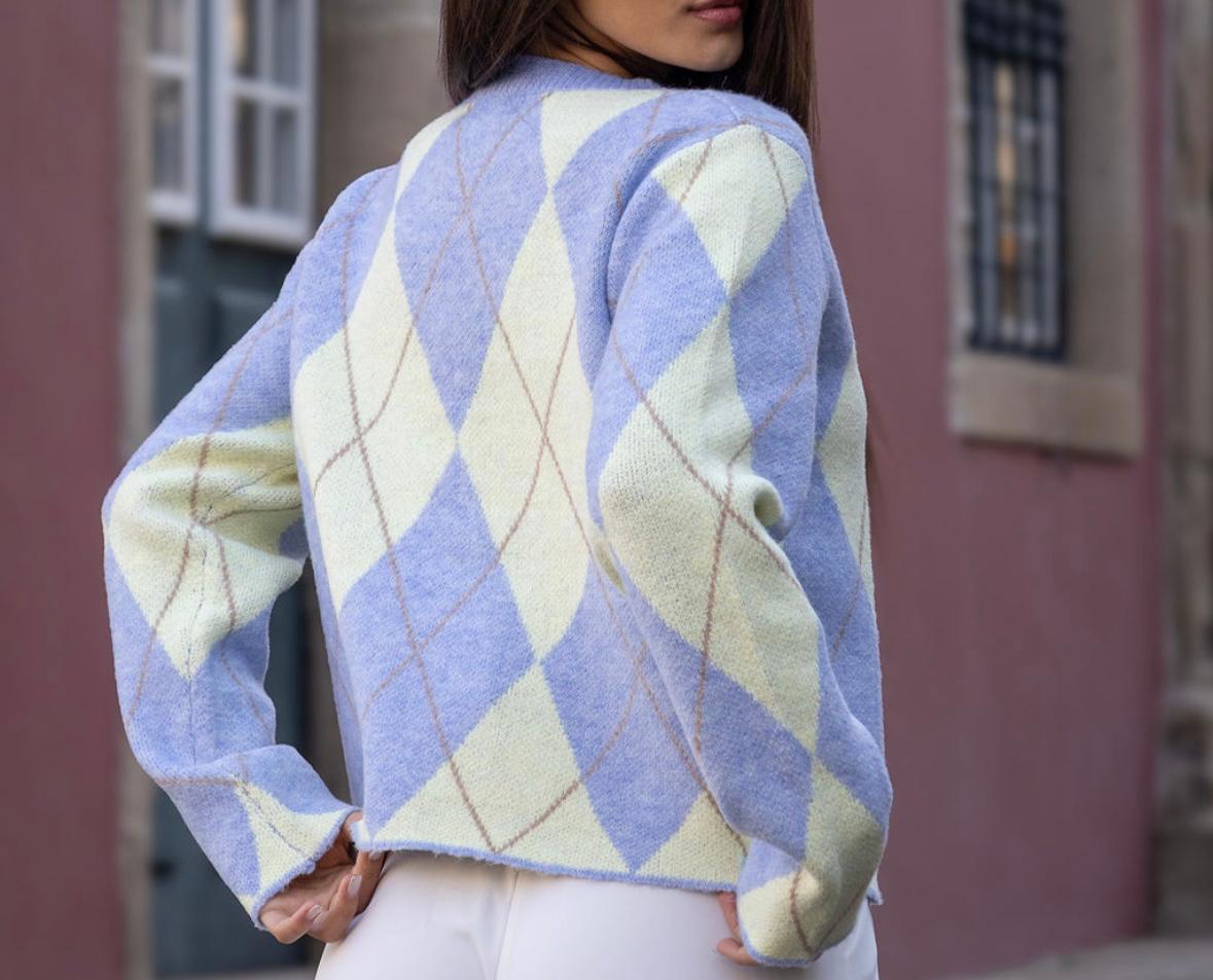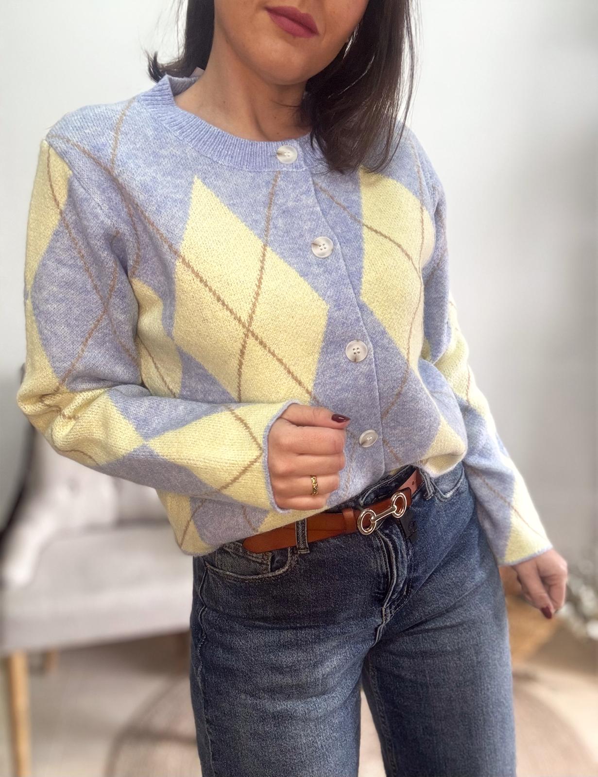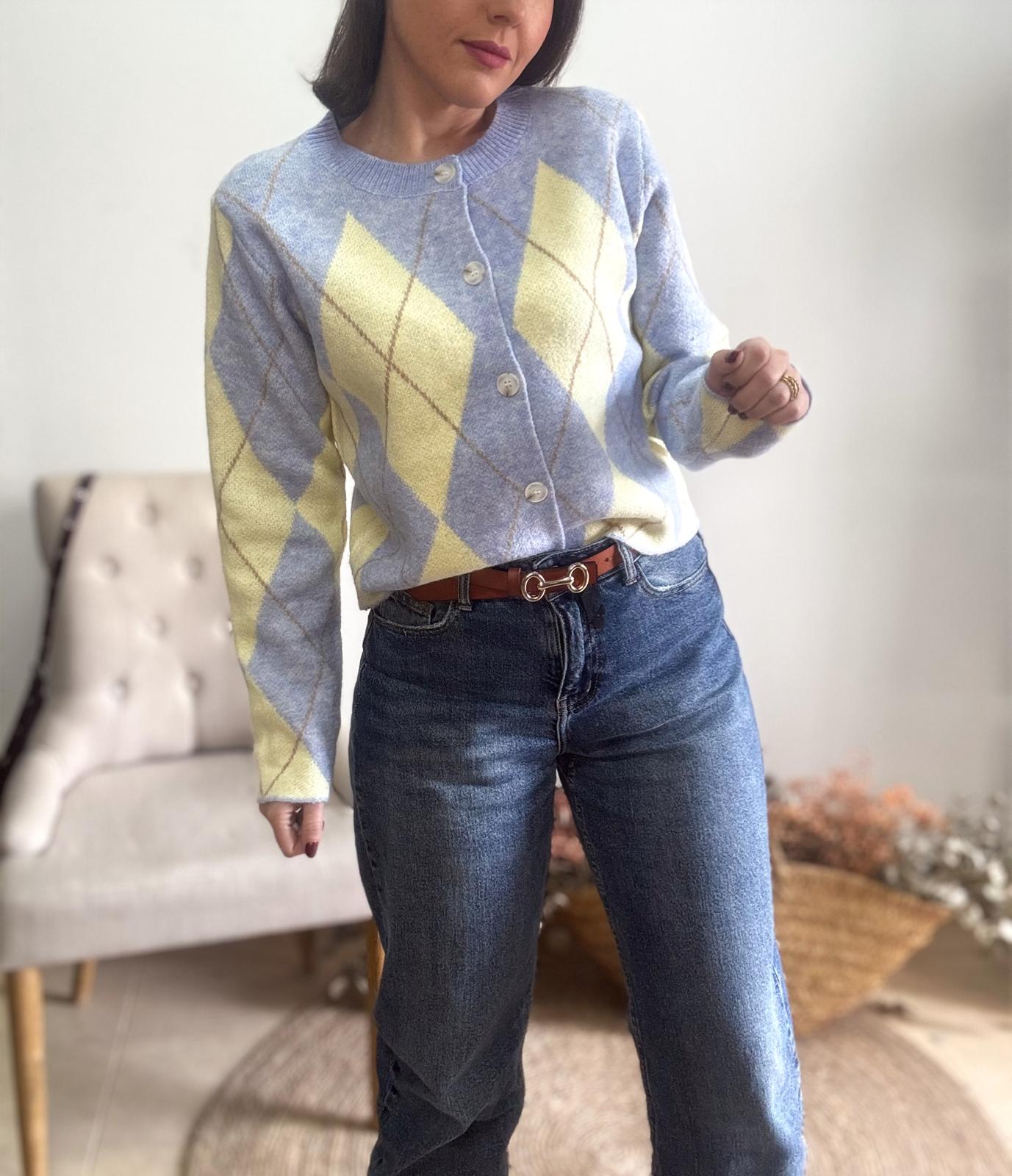 REBECA DE ROMBOS AMARILLO MANTEQUILLA Y AZUL BEBE.