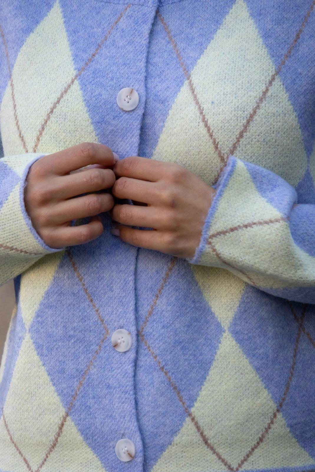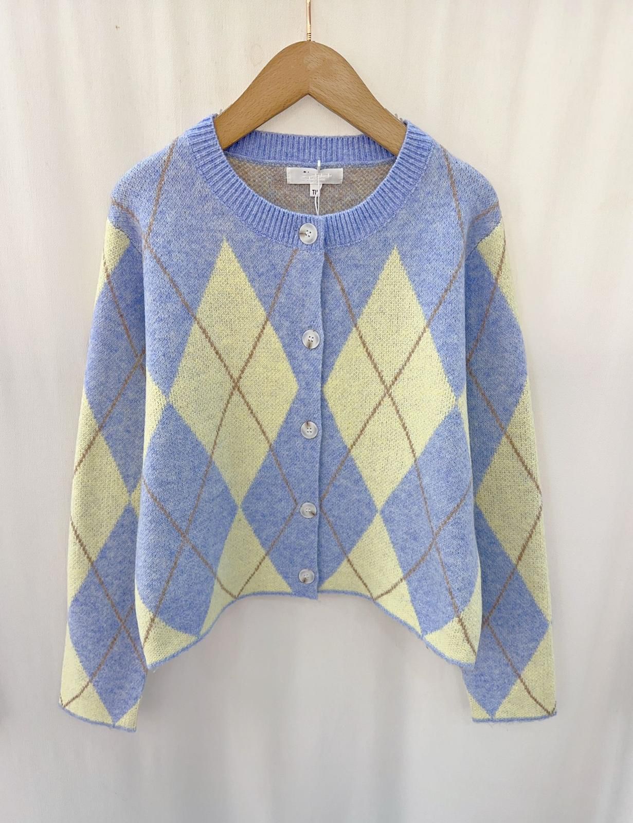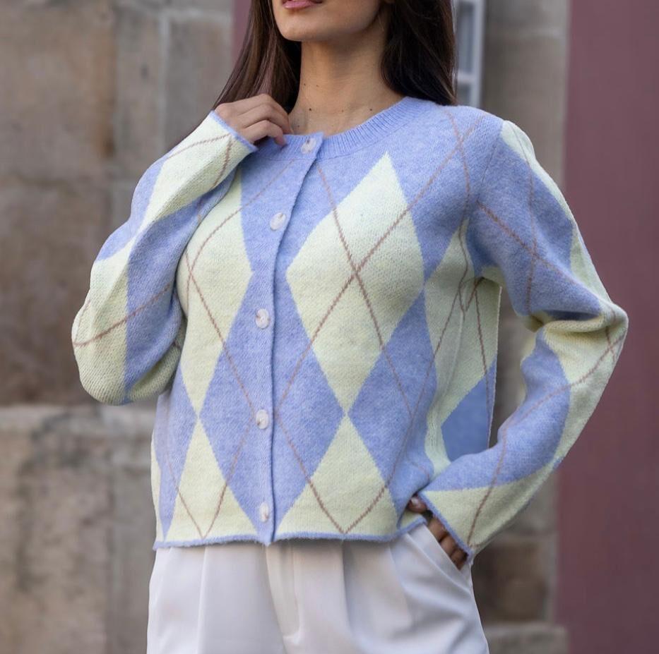 REBECA DE ROMBOS AMARILLO MANTEQUILLA Y AZUL BEBE.