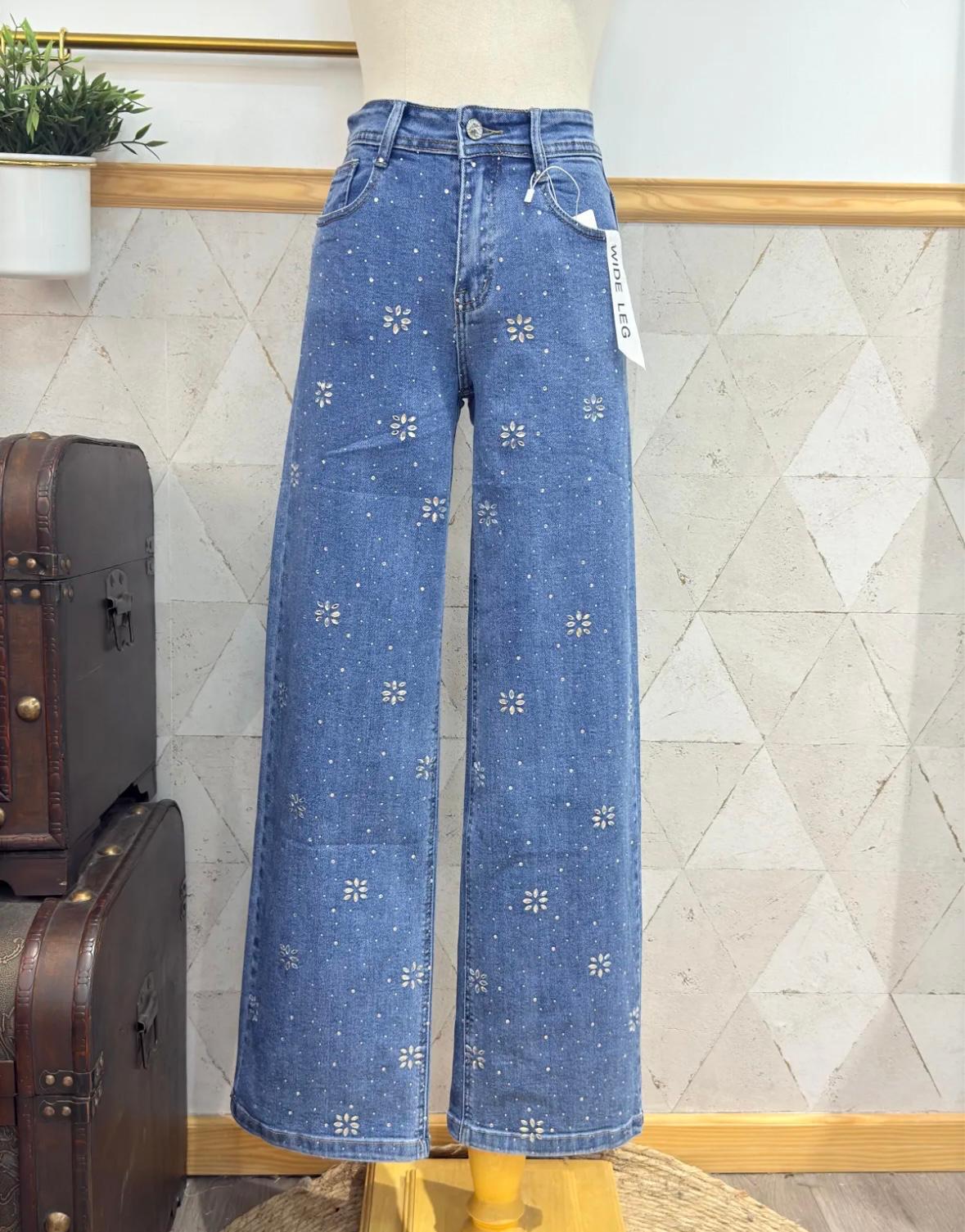 PANTALONES VAQUEROS CON ADORNO PERLITAS. TALLE ALTO Y PATA DE ELEFANTE