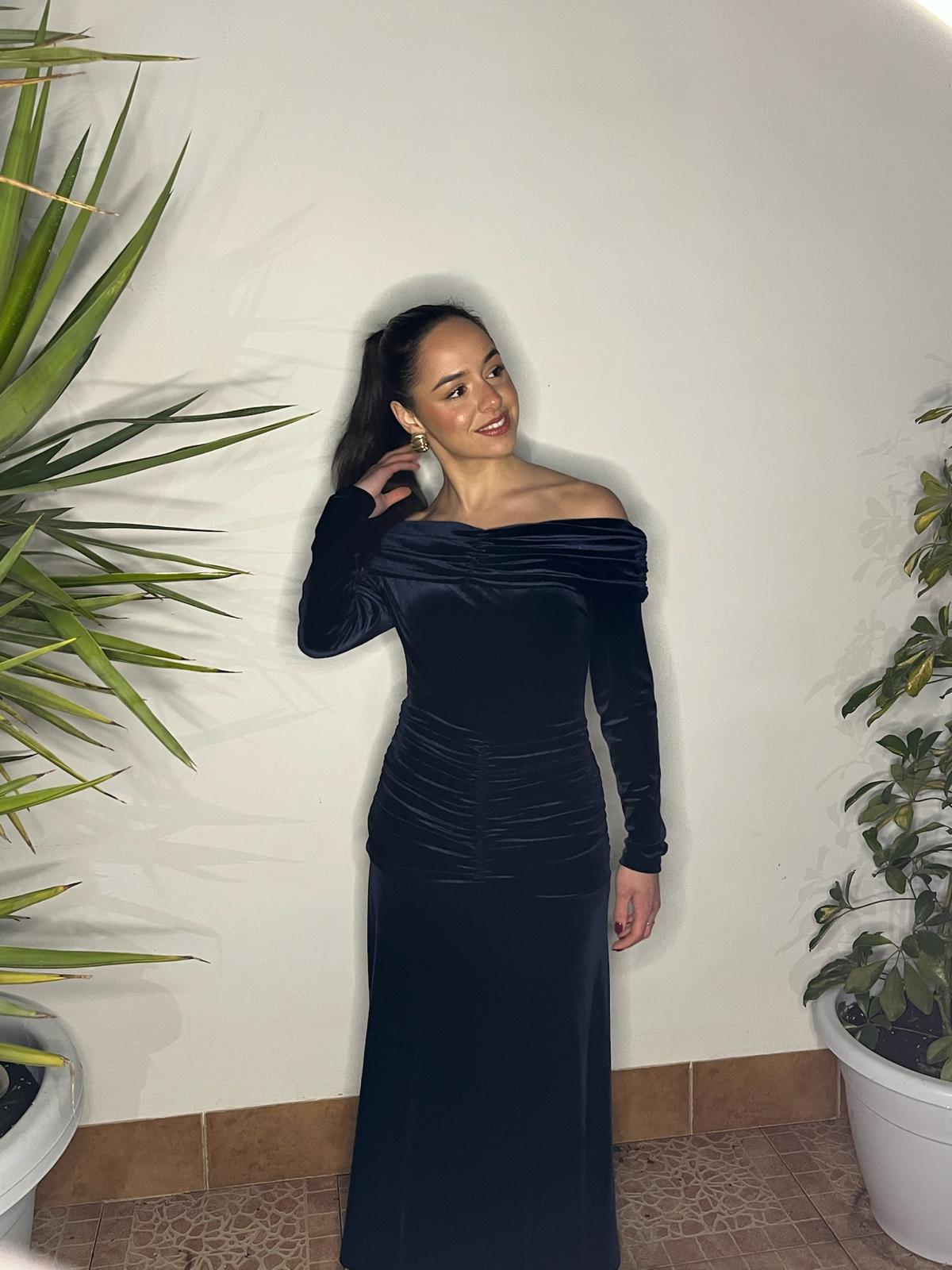 VESTIDO TERCIOPELO DE MANGA LARGA EN COLOR AZUL MARINO CON LOS HOMBROS AL DESCUBIERTO. TIENE UN DETALLE DE FRUNCIDO EN EL PECHO Y OTRO EN LA ZONA DEL ABDOMEN QUE LE DA UN TOQUE SOFISTICADO Y REALZA LA FIGURA.