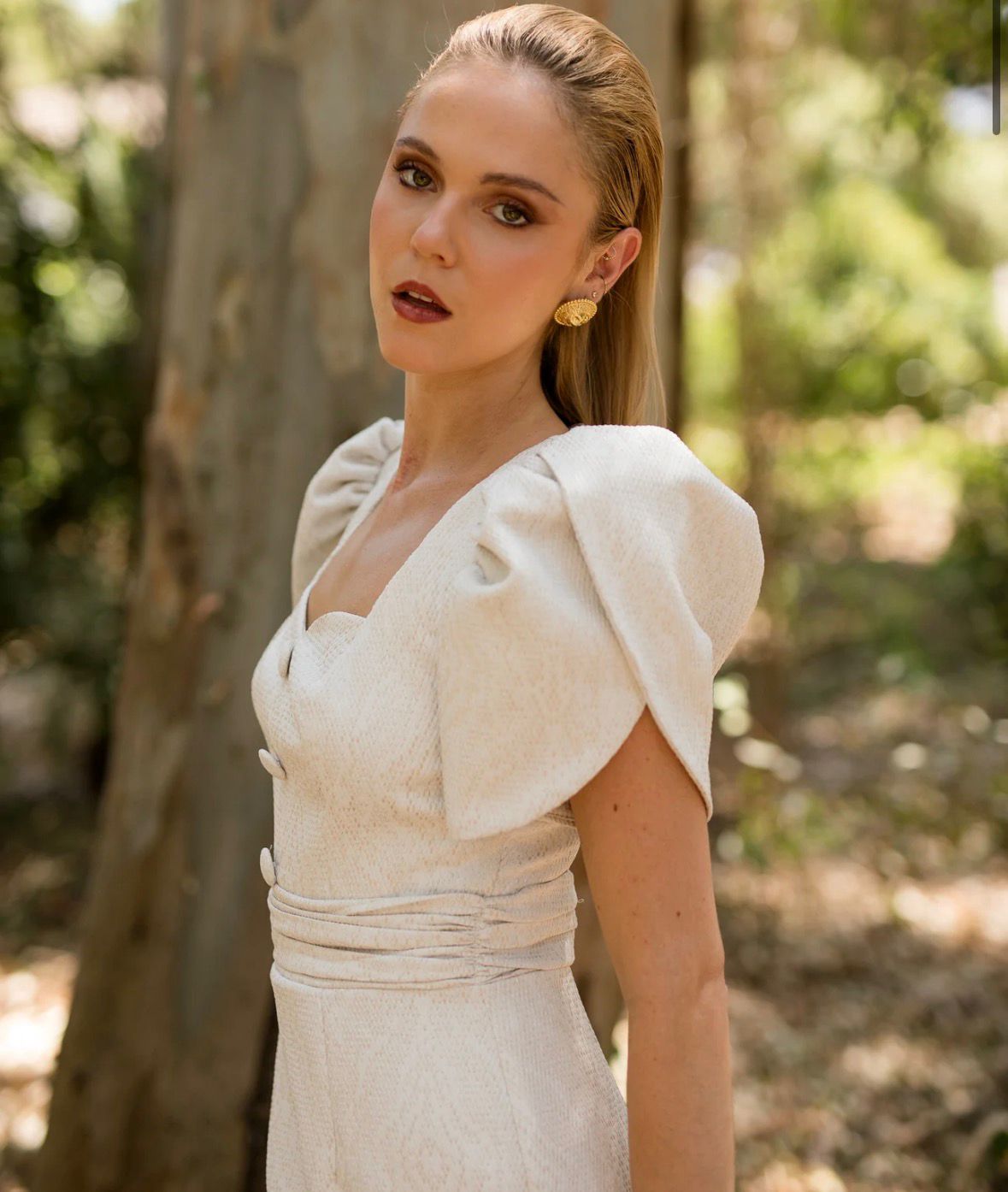SUS MANGAS DE CORTE MARIPOSA APORTAN VOLUMEN A LA PRENDA SIN PERDER LA ELEGANCIA. DETALLE DE TRES BOTONES FRONTALES FORRADOS DEL MISMO TEJIDO Y ABERTURA POSTERIOR QUE ARMONIZAN LA ESTRUCTURA DE LA PIEZA. IDEAL PARA NUESTRAS CLIENTAS MAS SOFISTICADAS.